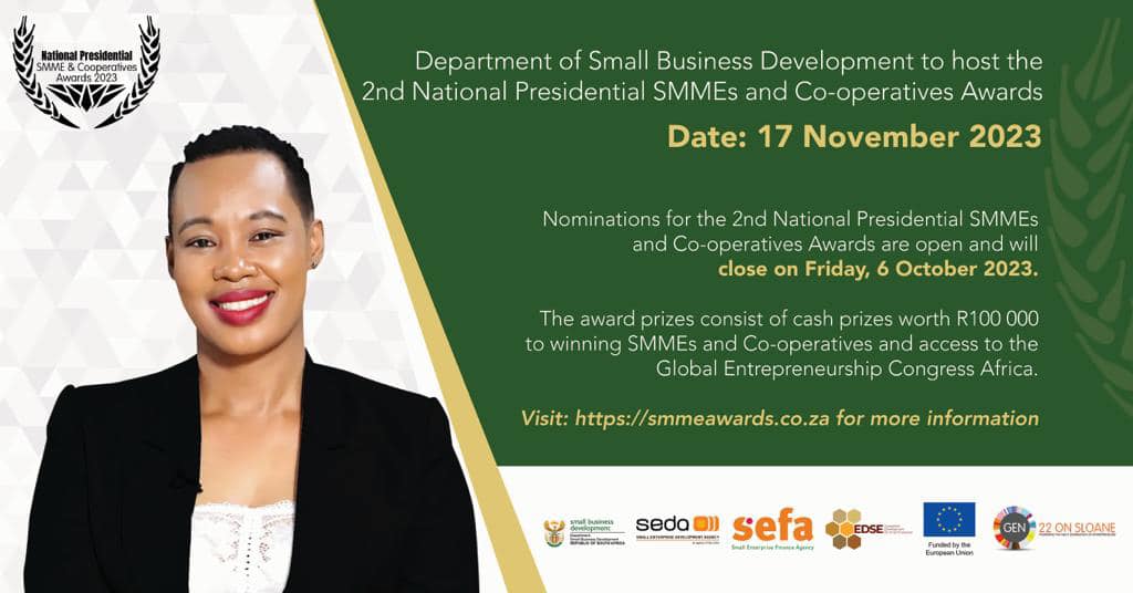 Nominations for the Inaugural National Presidential SMME Awards are open and will close on Friday, 6th October 2023. To nominate an SMME, Cooperative, Financier, Ecosystem Support Organisation, Corporate in each of the various categories, please visit the departments SMME Awards website.